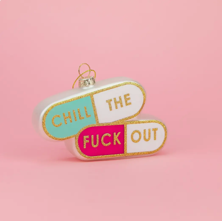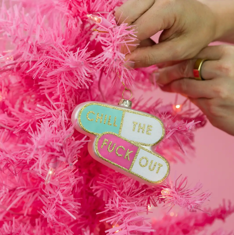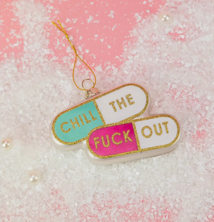 The Chill The Fuck Out Pill Glass Ornament is the stress relief your Christmas tree didn’t know it needed. Hand-blown in bold color-blocked glass — pink, teal, and white — with gold glitter text, this festive ornament delivers an instant dose of holiday calm (no prescription required).