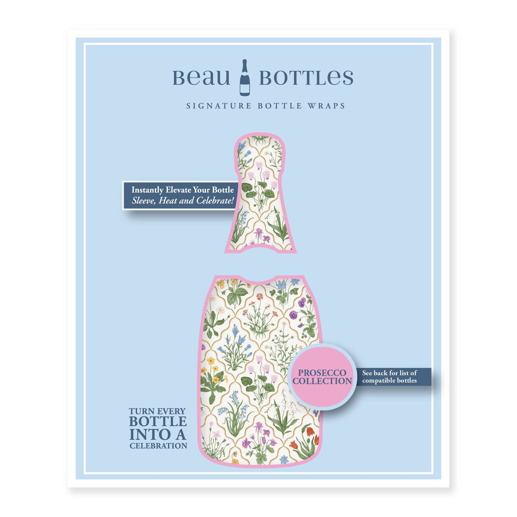 Transform your champagne bottle into an eye-catching masterpiece with our Beau Bottles wrap. Whether gifting or celebrating, this elegant wrap seamlessly blends with the bottle, adding a touch of sophistication to any occasion. Simply slip the wrap over the bottle, use a hairdryer or hot water to shrink it into place, and enjoy a smooth, professional finish. Designed specifically for La Marca 750ml, it turns an ordinary bottle into an extraordinary statement piece. Our Beau Bottles wrap, priced at $5.95, delivers the same luxurious, eye-catching look as $200 painted bottles and $30 decoupaged bottles, but with dramatic savings: * Vs. Painted Bottles: Saves $190.05 per bottle (95%) and hours to days of time, offering a budget-friendly way to achieve a “professional finish” for gifting or events. * Vs. Decoupaged Bottles: Saves $25.05 per bottle (80%) and 3–6 hours per bottle, eliminating labor and skill barriers while matching the “sophisticated” aesthetic. The wrap’s easy, 1-minute application, waterpro
