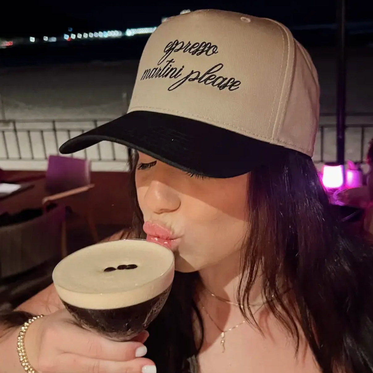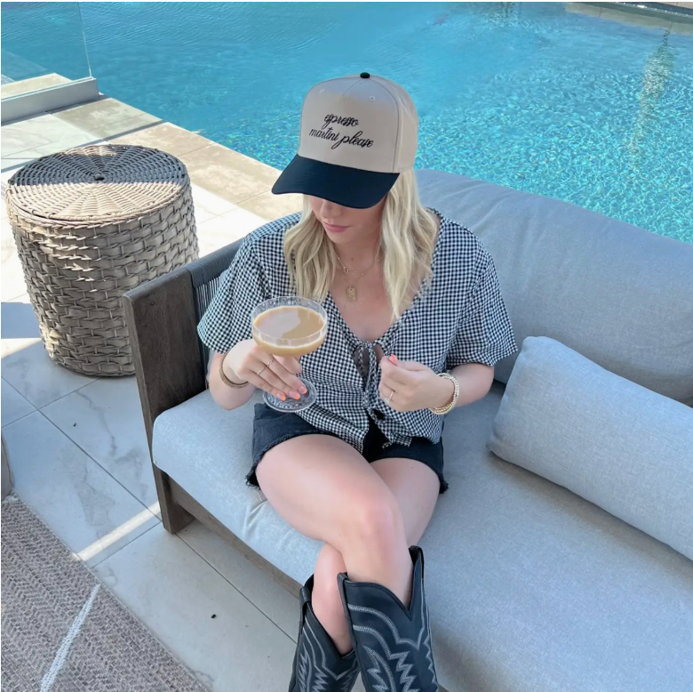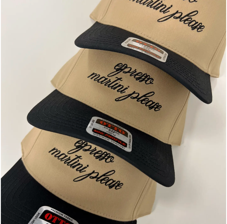 This hat is perfect to wear out to happy hour to enjoy drinks! This hat is a baseball cap khaki/black colored hat with black thread