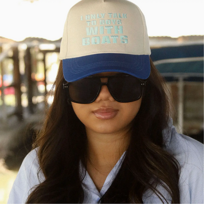Don't talk me unless you have a boat! This ivory and blue two tone trucker features an icy blue embroidery for those girls that only talk to boys with boats.