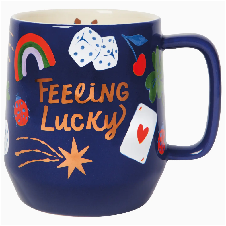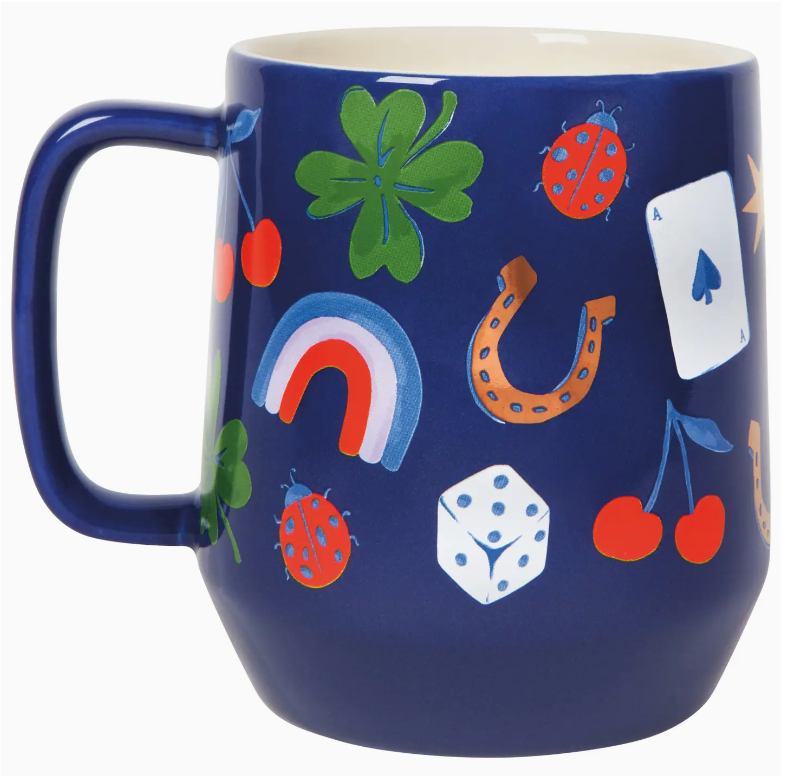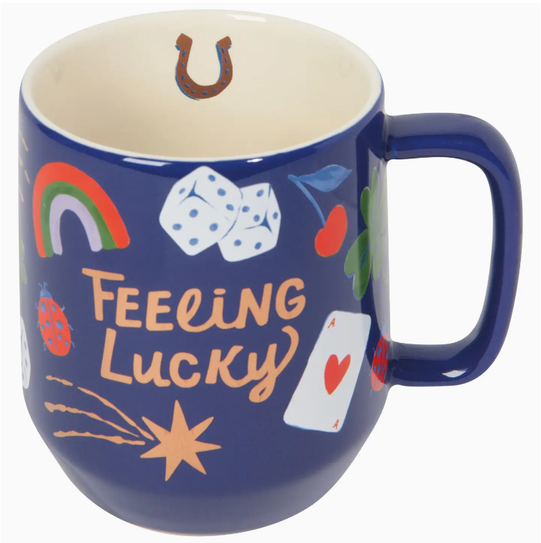 With a pattern of charms and colors so bright, may good luck abound, each day and each night with the Feeling Lucky mega mug. Horseshoes and clovers, rainbows and stars, adorn this charming design from the the Feeling Lucky collection. Bonus features include a sweet inner decal and gold glaze.