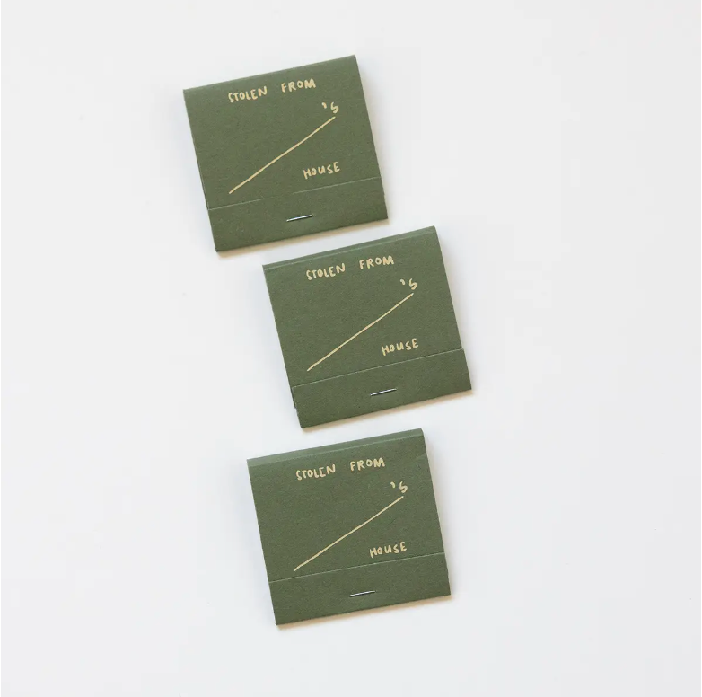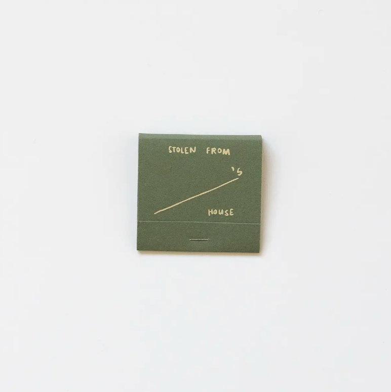 Our matchbox features a charming design that says "Stolen from _____'s house" in a playful font. It's a fun touch that adds to any housewarming party.